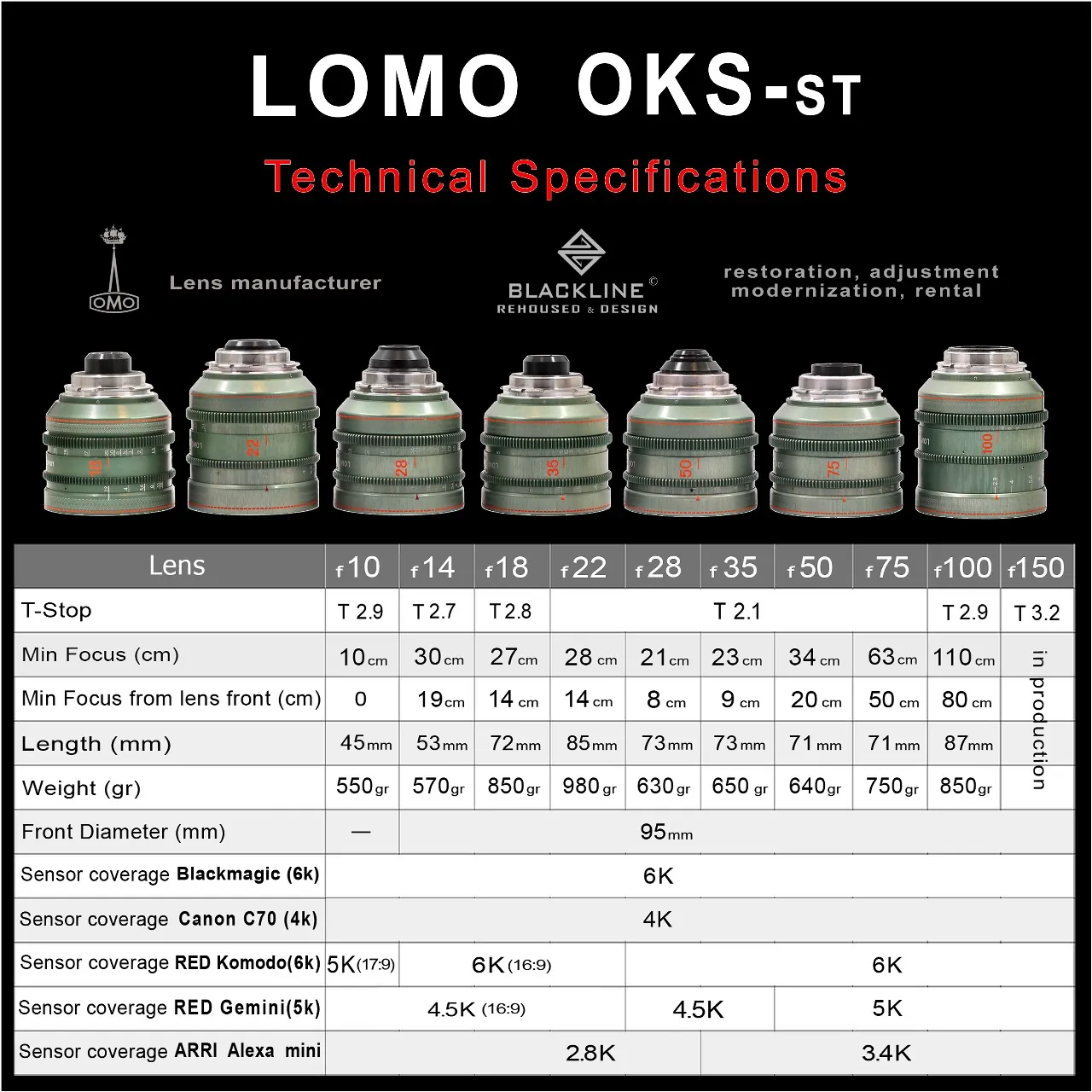 Эти линзы, изначально выпущенный для кинокамеры Kinor-35, находятся в отличном состоянии и были глубоко модернизированы компанией «BlackLine» с целью соответствия требованиям современного кинопроизводства. Все объективы получили новый алюминиевый