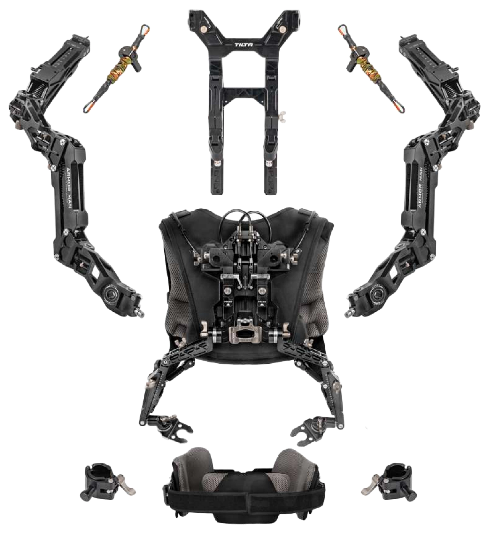 Две механические руки с амортизирующими стабилизированными системами крепятся к задней части регулируемого жилета или сверху жилета в высоком режиме.