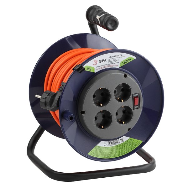 Удлинитель электрический на катушке ЭРА RPx-4es-3х0.75-30m. имеет 4 розетки с заземлением и длину кабеля 30 метров.Установлена удобная ручка для переноски. Удлинитель можно применять для бытового и профессионального использования.