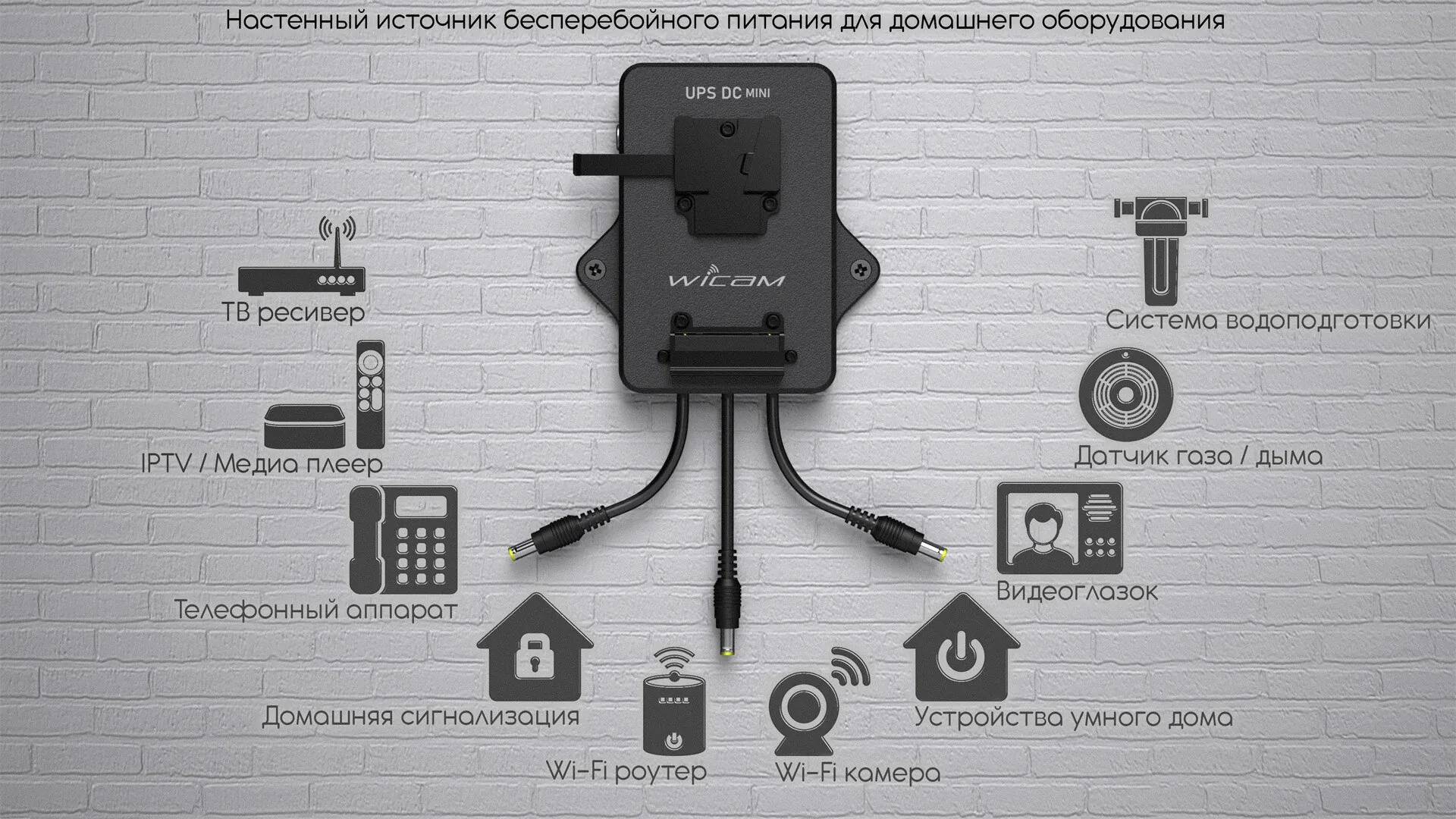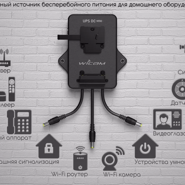 От старшего собрата – UPS DC – отличается отсутствием сменных DC-модулей и более компактным корпусом.Представьте: внезапный блэкаут, а Ваш Wi-Fi роутер продолжает вещать, камеры бдительно сканируют периметр, умный дом послушно выполняет команды, ТВ-ресивер транслирует финал любимого сериала, а датчик газа тихо, но уверенно охраняет Ваш покой. Нет паники, нет потери связи, нет риска для безопасности. Это не фантастика — это UPS DC mini – революционный адаптер бесперебойного питания, несущий на борту площадку для профессиональных накамерных аккумуляторов V-mount или Gold-mount (B-mount уже в разработке). Те самые “кирпичи” ёмкостью 45–300 Wh, которые питают голливудские камеры на съёмках в пустыне или на высоте, теперь становятся резервным генератором для Вашего дома – просто повесьте аккумулятор на UPS DC mini, и, в случае отключения сети, переход на батарею происходит автоматически, без малейшей задержки. А при наличии сетевого напряжения, входящий в комплект блок питания подзаряжает аккумулятор и питает подключенное домашнее оборудование.Адаптер оснащается тремя встроенными DC-модулями с выходным напряжением 5V / 9V / 12V или 15V на выбор — подключайте что угодно: от смартфона и стационарного телефонного аппарата до медиаплеера, видеоглазка, домашней сигнализации, системы водоподготовки, устройств умного дома и многого другого.Для удобства устройство можно закрепить на стене, чтобы хаб не занимал место на столе, а висел незаметно, как супергерой в тени.UPS DC mini это больше, чем просто уникальный профессиональный девайс от Wicam. Это инвестиция в спокойствие: когда соседи в панике ищут фонари, Вы наслаждаетесь стабильным интернетом, безопасностью и комфортом. В мире, где электричество капризно, как примадонна на съёмках, UPS DC mini — Ваш надёжный режиссёр, который никогда не скажет “Стоп!”._________________________________Параметры:Аккумуляторная площадка: V-mount / Gold-mount / B-mount (ожидается)Входной разъем для блока питания: Lemo2pin 0BВходное напряжение блока питания: AC 100v – 240vВыходное напряжение блока питания: DC 16.8v (для V-mount / Gold-mount)Входное напряжение UPS DC mini: DC 16.8v (для V-mount / Gold-mount)Выходное напряжение UPS DC mini: DC 5v / 9v / 12v / 15v (всего 3 встроенных DC-модуля. Напряжение каждого модуля выбирается Вами при заказе)Выходные разъемы: DC 5.5×2.1 / DC 5.5×2.5 / USB-C (всего 3 выхода. Разъем на каждом выходе выбирается Вами при заказе)Выходная мощность каждого встроенного DC-модуля: Максимально 3AПереход AC-DC-AC: Автоматический без задержкиВстроенные защиты: От перегрузки / перегреваМатериал корпуса: 3D-printed PETG Carbon 15% (FDM)Размеры: 116x124x35ммМасса: 410г________________________В комплекте:– 1x UPS DC mini (V-mount или Gold-mount) с тремя выходами.При заказе Вы выбираете напряжение и разъем каждого выхода (5v / 9v / 12v / 15v ; 5.5×2.1 / 5.5×2.5 / USB-C)Длина каждого DC выхода 10-15см.– 1x AC блок питания (16.8v, 50w) с угловым Lemo2pin 0B (данный блок питания подойдет для большинства сценариев. Но мы рекомендуем по возможности заранее посчитать суммарное энергопотребление всех устройств, которые Вы планируете подключить к UPS DC mini, чтобы точно определиться с параметрами необходимого Вам блока питания. Просто напишите нам и мы всё решим).____________Заметка: когда Вы определитесь с местоположением устройств и длиной кабелей, то Вам останется локально докупить стандартные DC-DC удлинители 5.5×2.1/5.5×2.5, доступные на любом маркетплейсе.