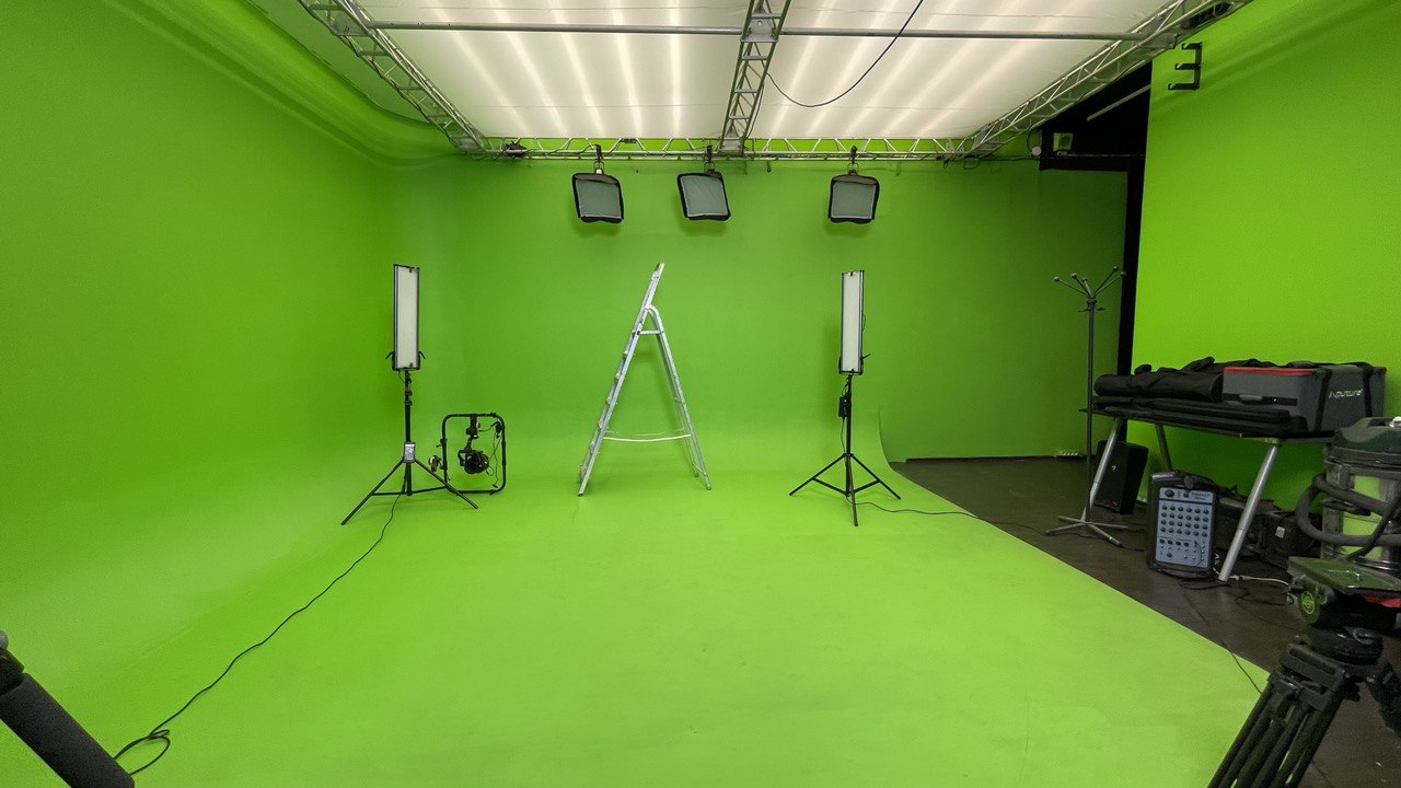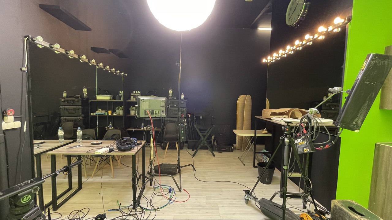 Особенности:Блэкаут, Бумажные фоны, Генератор тумана, Заезд для машины, Зеленая циклорама, Свой свет
